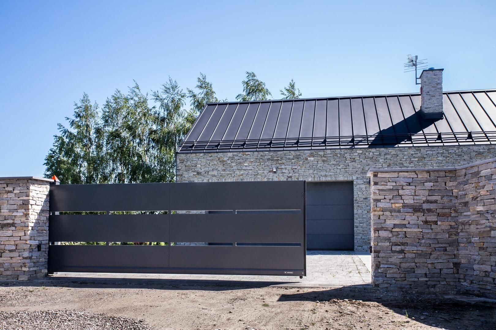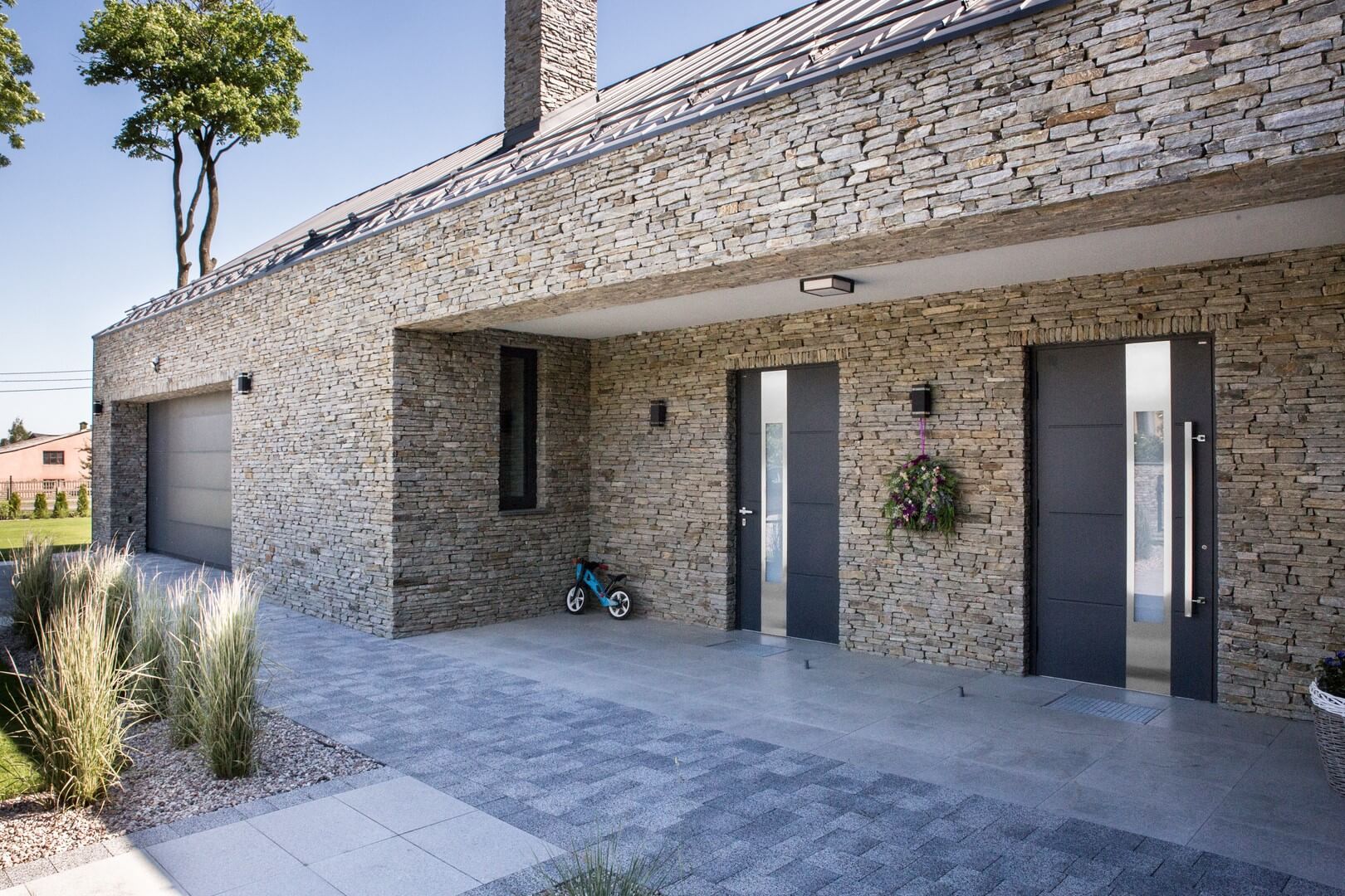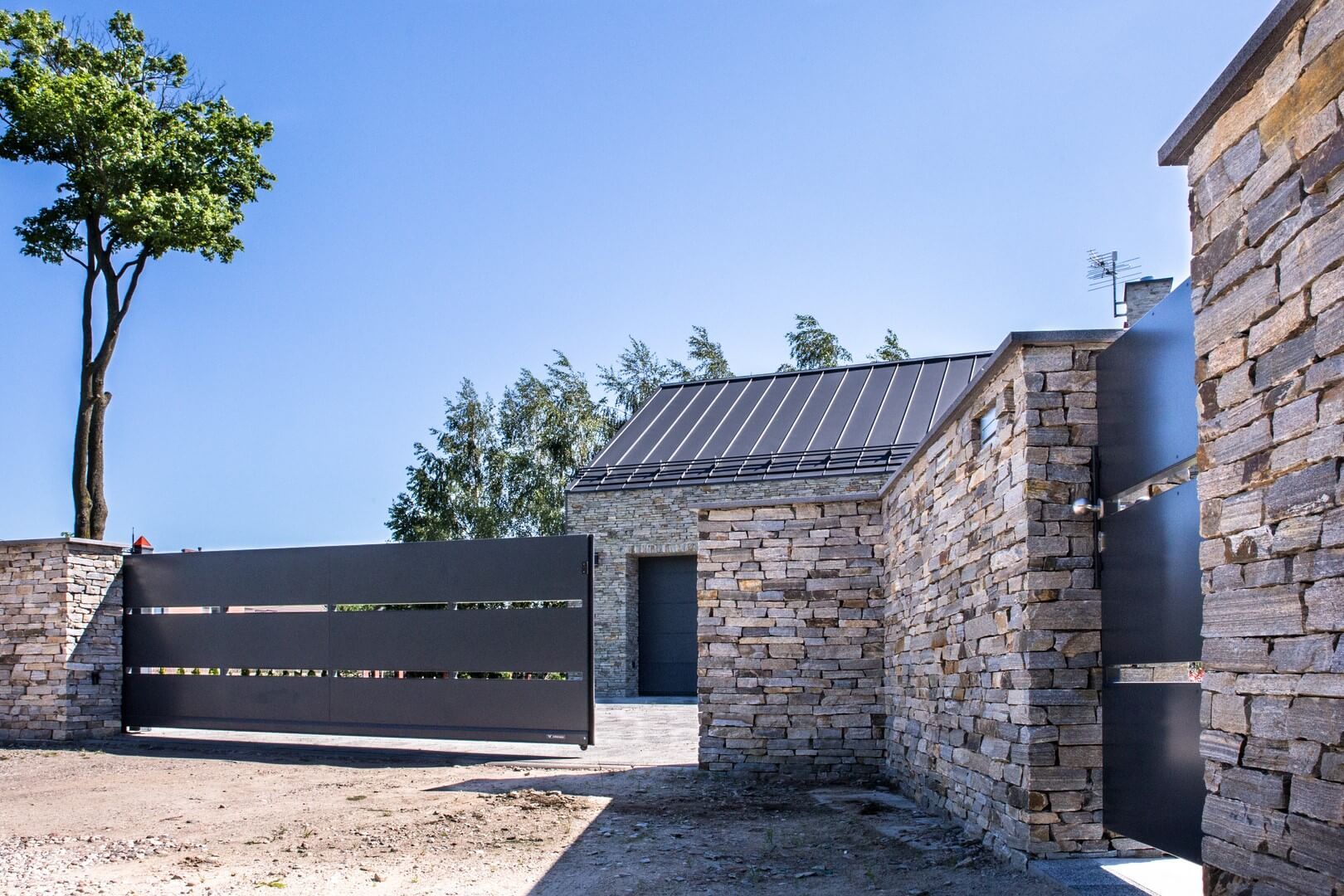 Für die Fassade und das Zaunsystem wurde Naturstein gewählt, ergänzt durch anthrazitfarbene Elemente wie Eingangstüren, Segmenttor und die Zaunanlage. Die natürliche graue Steinfarbe harmoniert perfekt mit der tiefen Antrazitlinie der modernen WIŚNIOWSKI-Produkte.