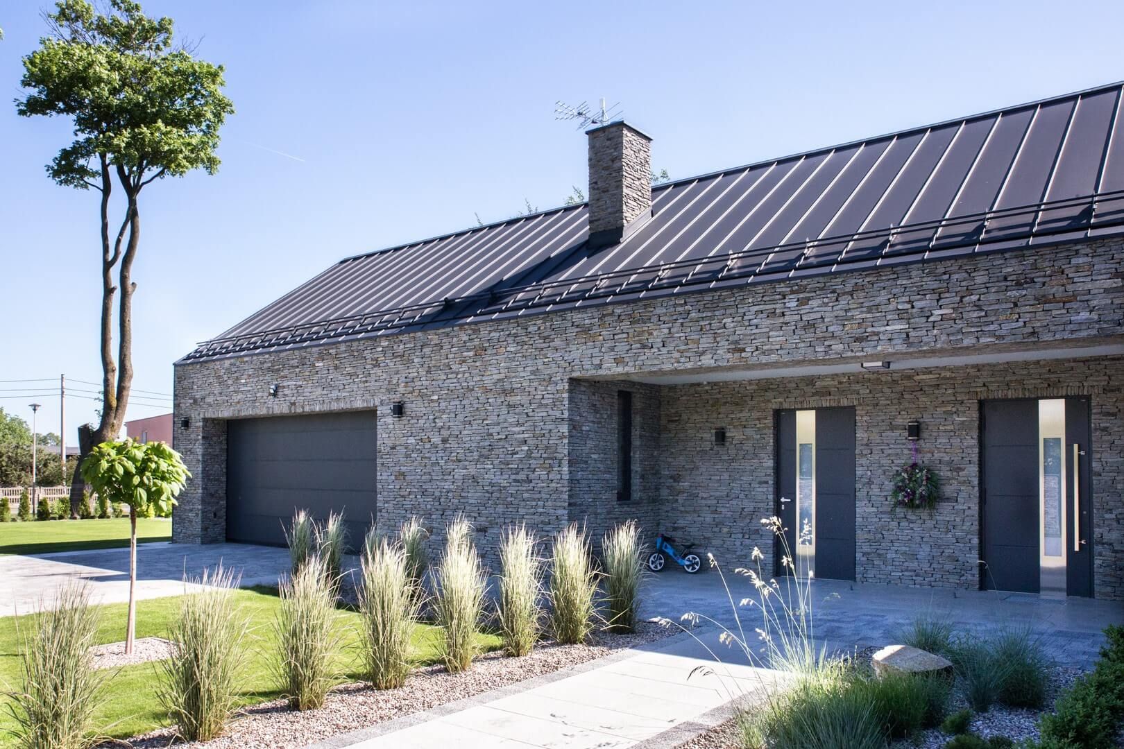 Die Fassade dieses Hauses wurde vollständig mit Naturstein gestaltet. Dazu kamen klare, moderne Elementen in Anthrazit: die CREO Haustür, das UniPro-Garagentor und das dunkle Dach.