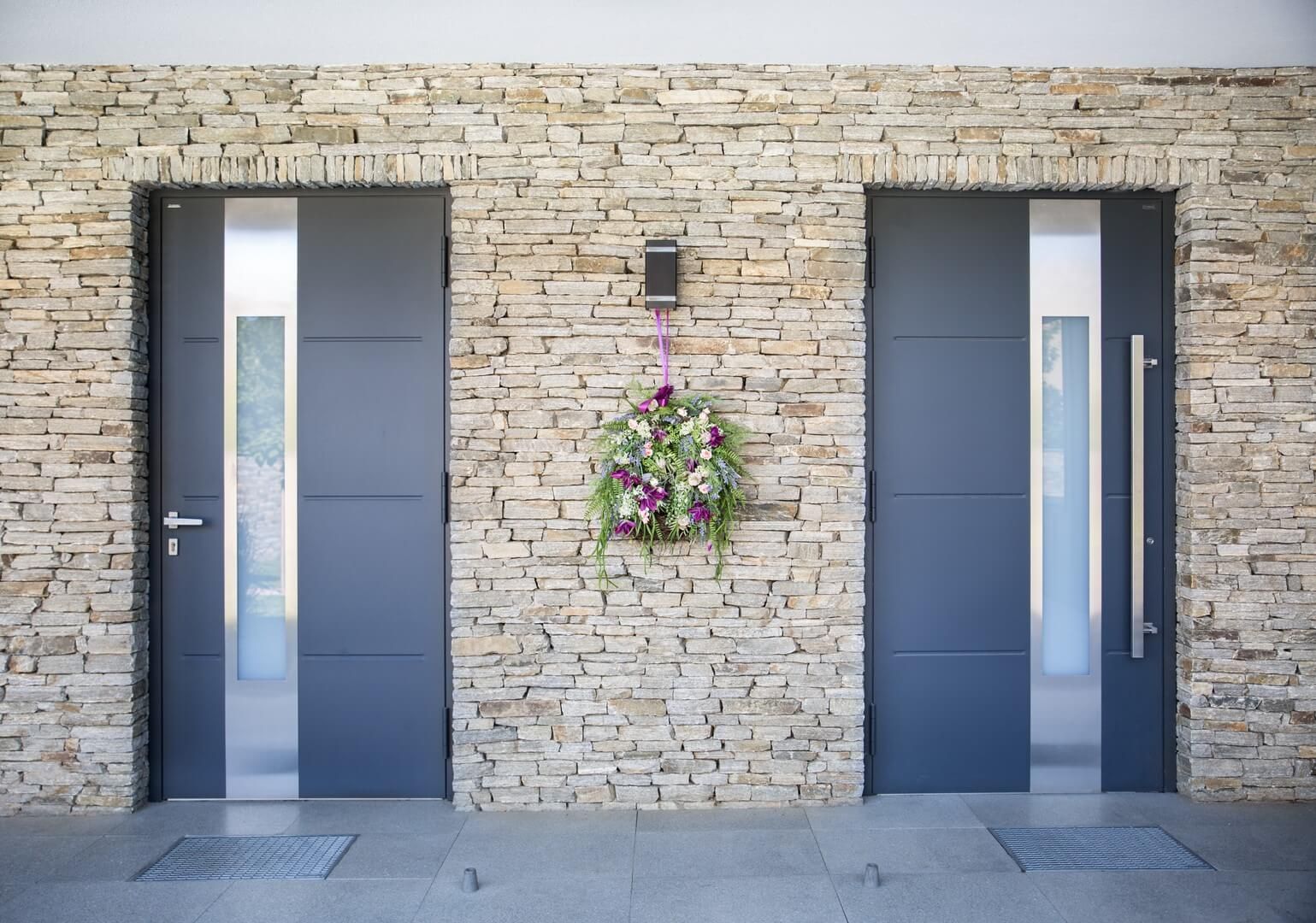 Die Kombination aus natürlicher Steinstruktur und minimalistischen Formen schafft eine ruhige, elegante Komposition. Die waagerechten Linien der Paneele und die feinen Details der Tür verbinden sich mit dem rhythmischen Muster der Steinfassade und unterstreichen den modernen Charakter.
