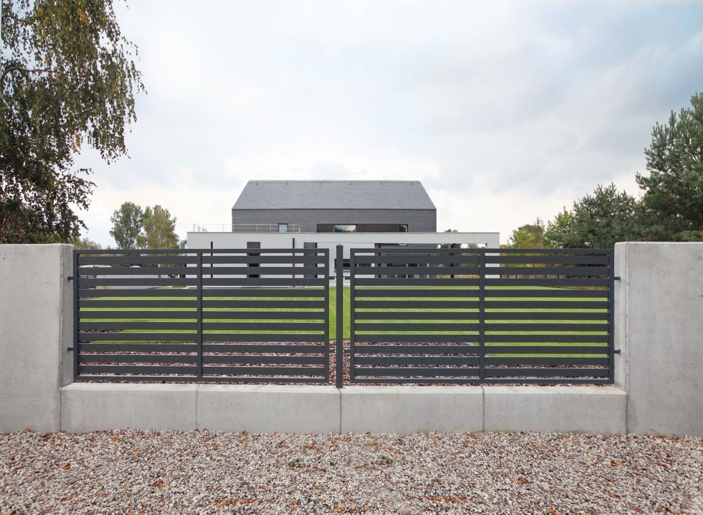 Die Zäune mit horizontalen Profilen oder geschlossenen Flächen fügen sich nahtlos in die heutige Bauästhetik ein. Sie betonen den Charakter des Gebäudes, ohne ihn zu dominieren, und schaffen gleichzeitig eine klare Abgrenzung, die Privatsphäre und Sicherheit bietet.
