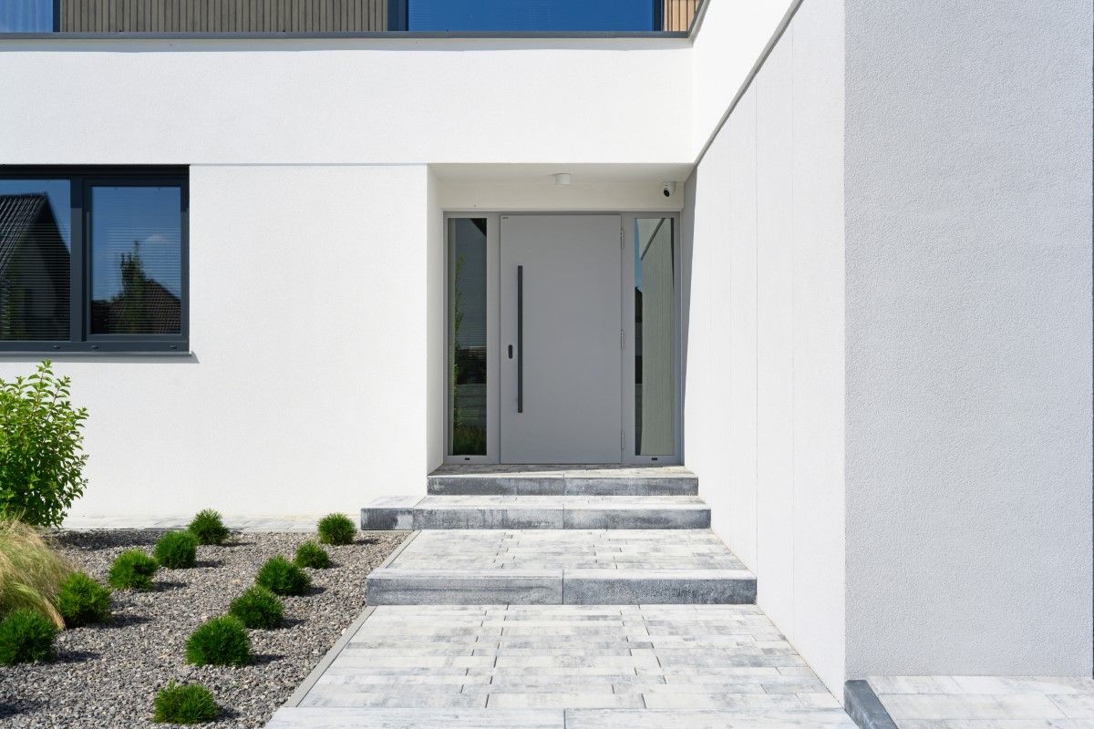 - Minimalistische Bauten Reduktion auf das Wesentliche – glatte Flächen, mattes Weiß, Anthrazit oder Basaltgrau. Farblich abgestimmte Tore und Türen betonen die Geometrie und Reinheit der Form.