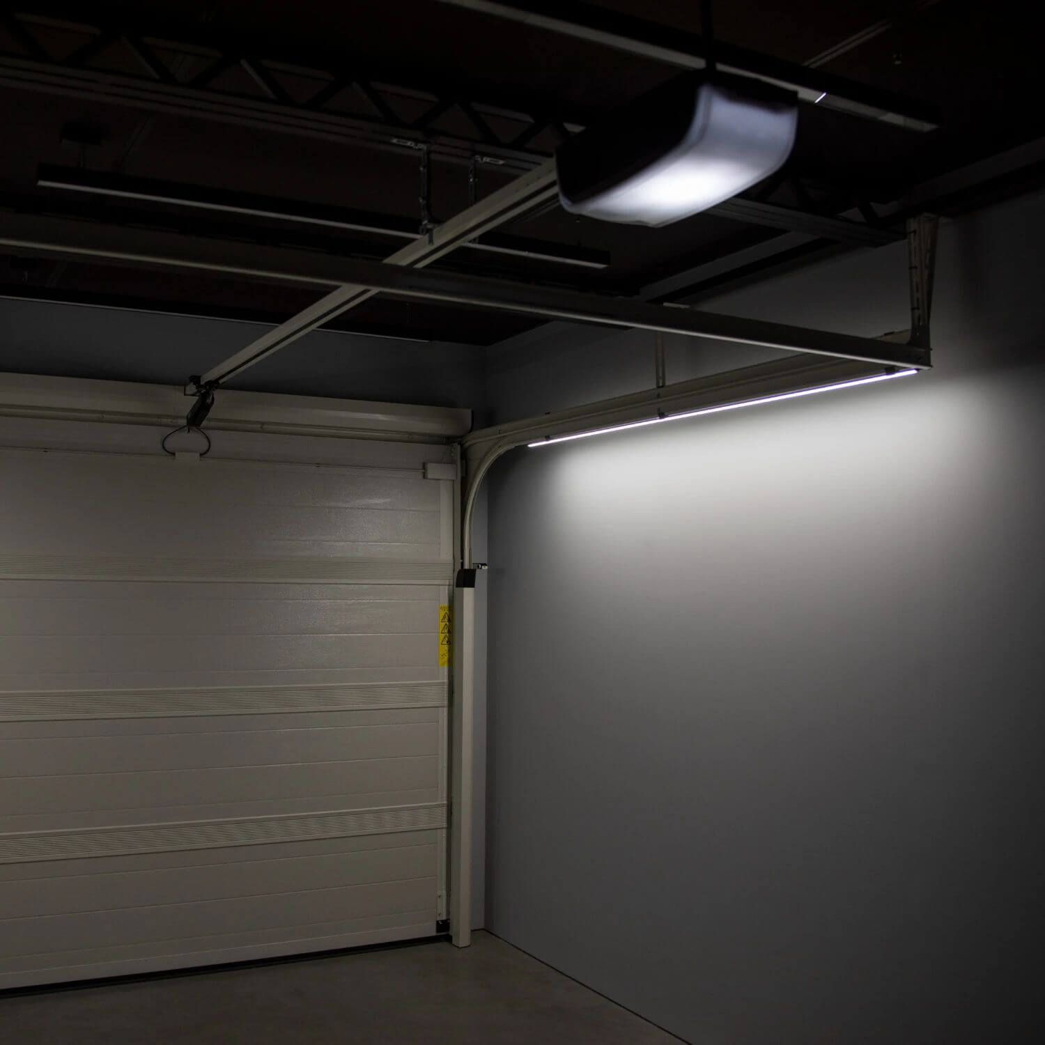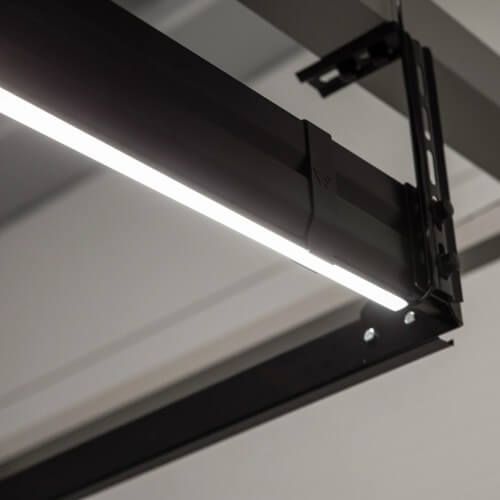 Die LED-Beleuchtung liegt an den beiden horizontalen Führungsschienen entlang. Sie ist dabei so konzipiert, dass man weder in einer älteren noch in einer neueren Garage keine Eingriffe in die Wände oder Decke vornehmen muss, um eine zusätzliche Stromquelle sicherzustellen. Die LED-Streifen befinden sich in eleganten, mattschwarzen Profilen aus Aluminium, die mit einem Klick an den speziellen flexiblen Halterungen an den Führungsschienen montiert werden. Diese Befestigung ist nicht nur elegant, sondern auch stabil.